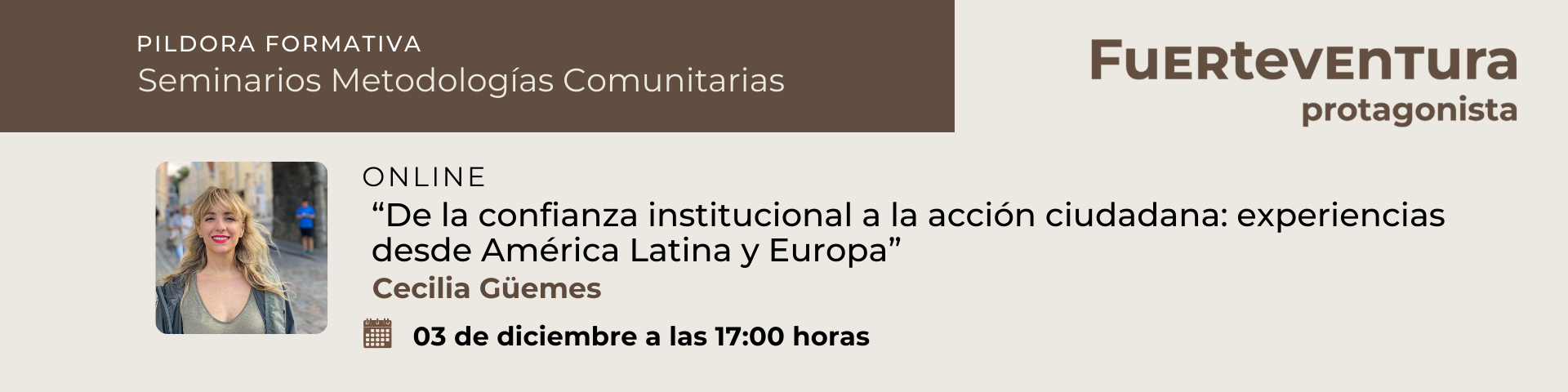 El noveno seminario de esta segunda fase ,‘De la confianza institucional a la acción ciudadana: experiencias desde América Latina y Eruropa’ tendrá lugar el miércoles 03 de diciembre a las 17.00 horas. Esta formación está dirigida a todas las personas que forman parte de la comunidad majorera. Su objetivo general es reflexionar sobre el papel de la confianza institucional como base de la participación ciudadana, y extraer aprendizajes de experiencias internacionales que puedan inspirar procesos colaborativos en Fuerteventura.
